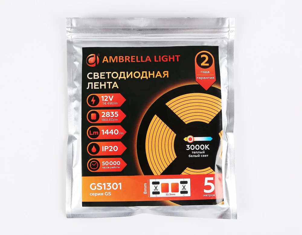 Светодиодная лента LED STRIP 12V 6500K 14,4W/m 5m Ambrella light GS1313