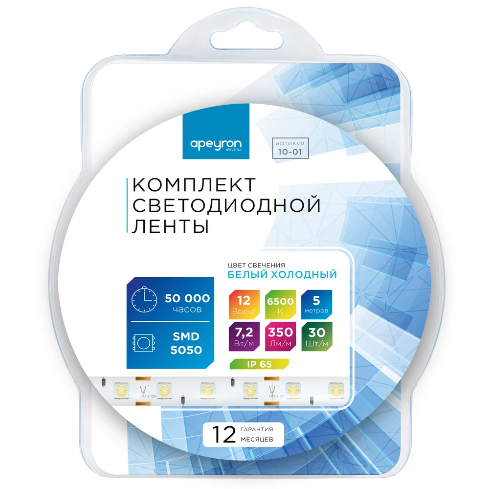 Светодиодная лента 12V 6500K 7,2W/m 5м Apeyron 10-01