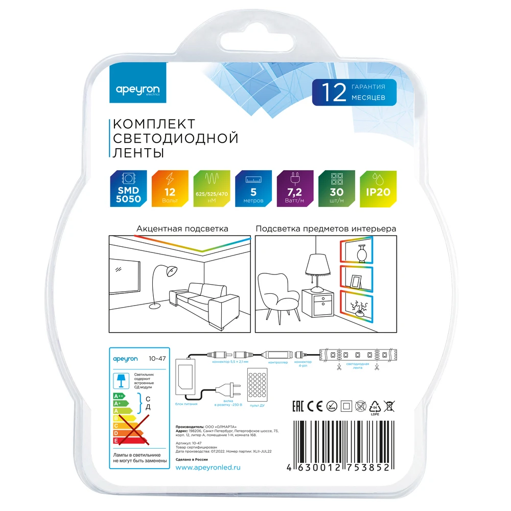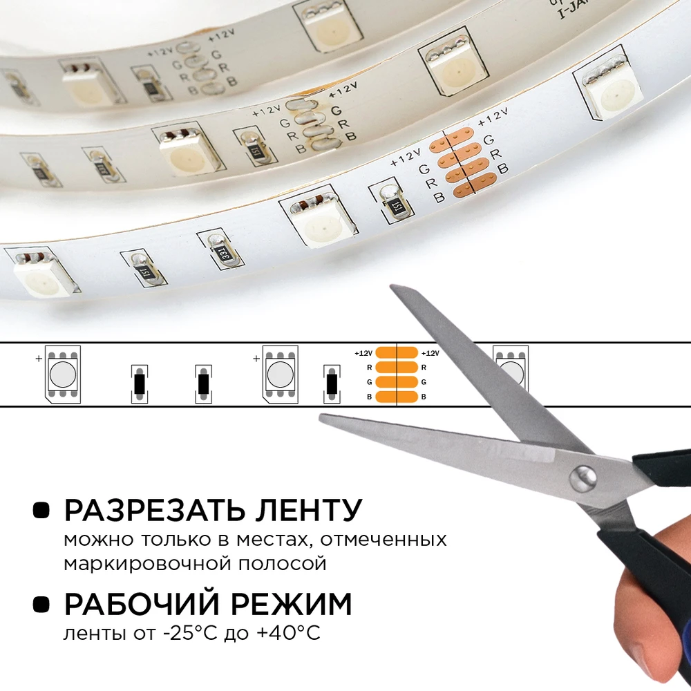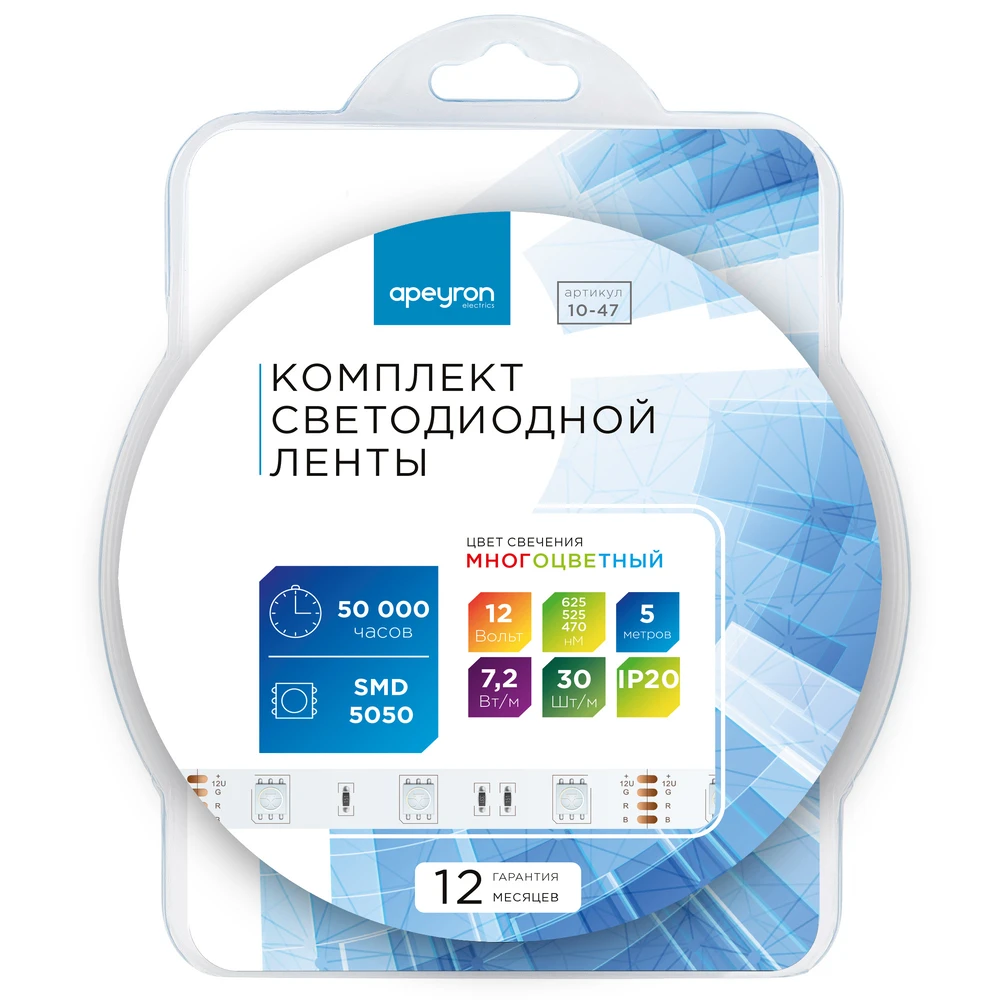 Светодиодная лента 12V Мультиколор 7,2W/m 5м Apeyron 10-47