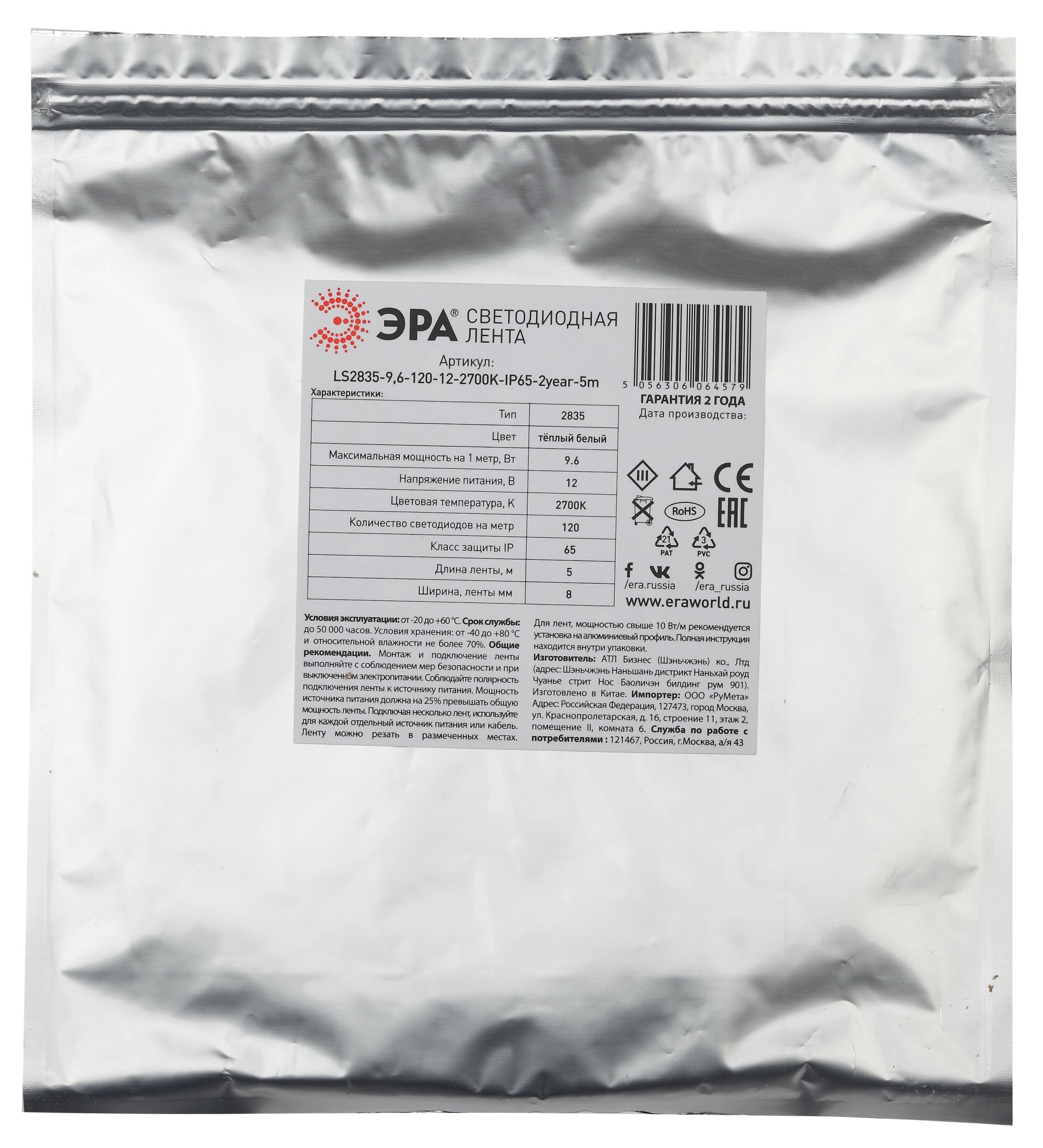 Светодиодная лента 12V 6500K 9,6W/m 5м Эра KU-2835AD-120D-W Б0044114