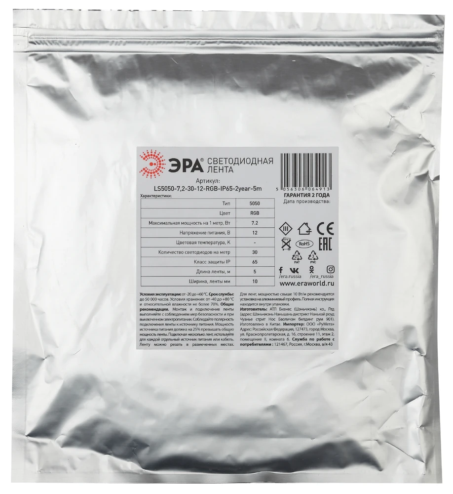 Светодиодная лента 12V Мультиколор 7,2W/m 5м Эра KU-5050AD-30D-RGB Б0044121