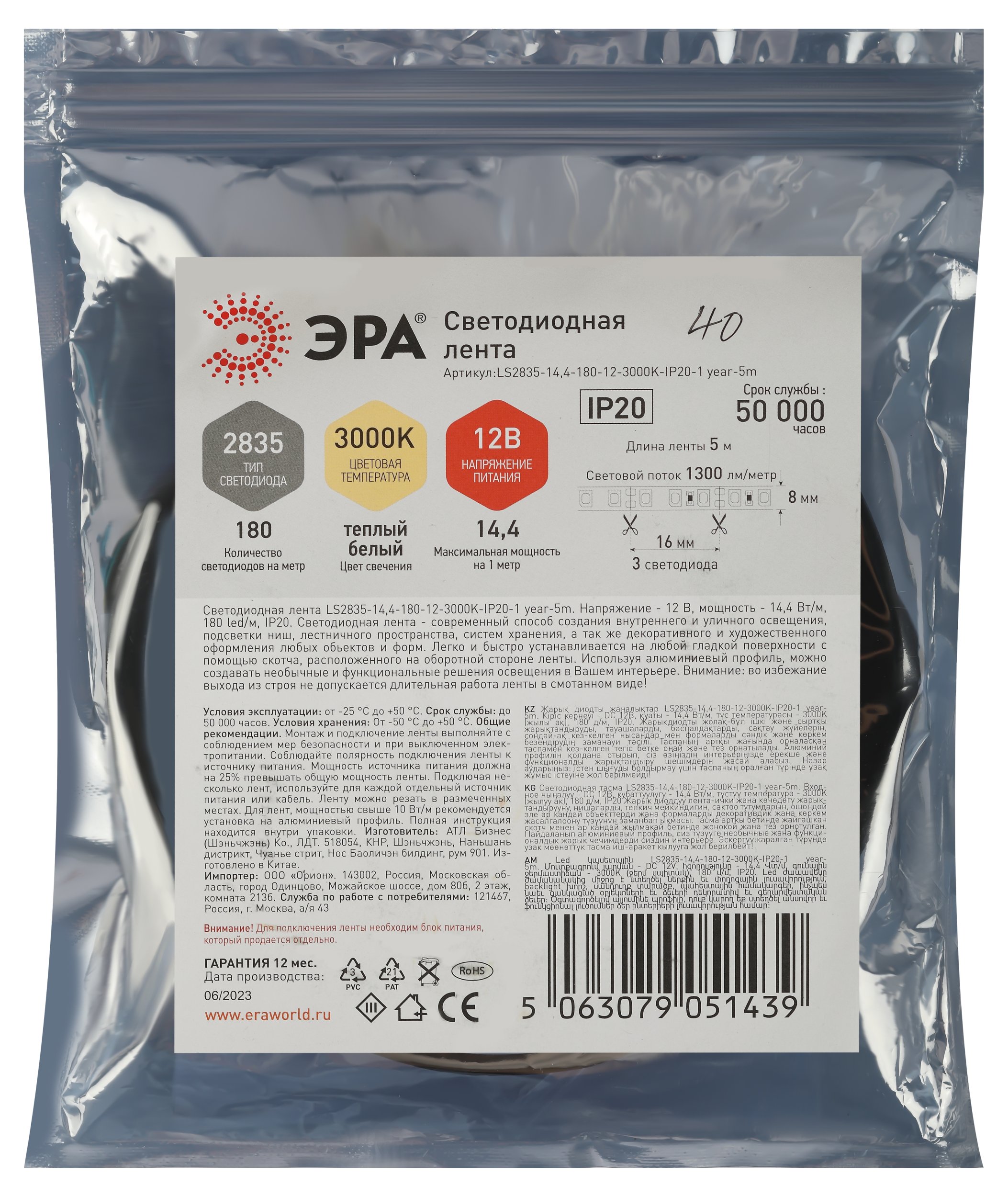 Артикул | LS2835-14,4-180-12-3000K-IP20-1 year-5m Б0059903