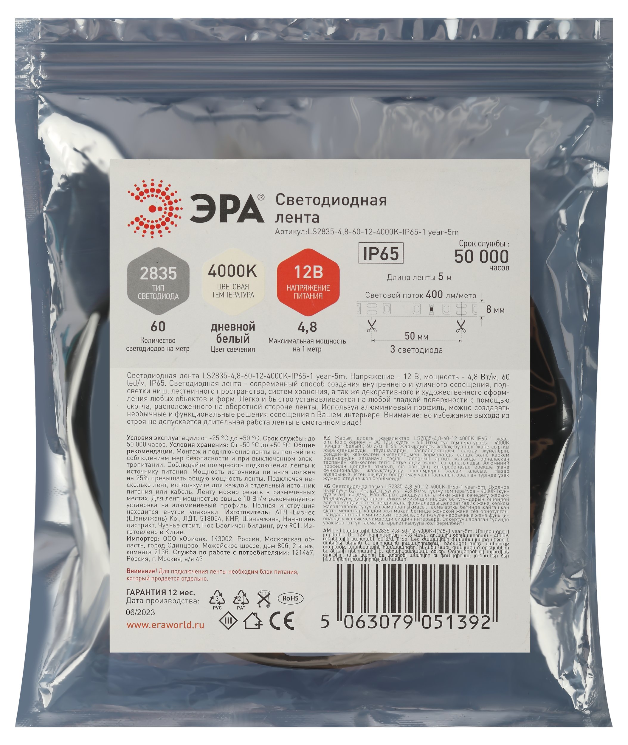 Артикул | LS2835-4,8-60-12-4000K-IP65-1 year-5m Б0059901