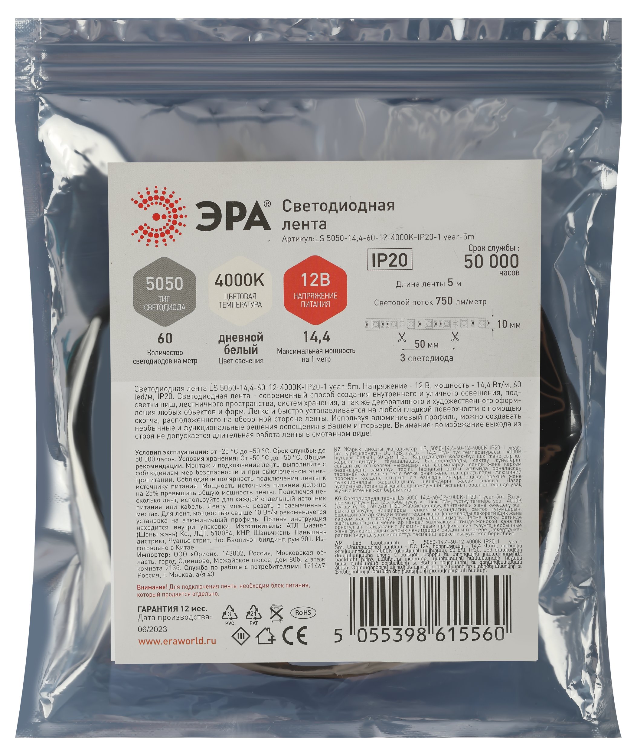 Артикул | LS5050-14,4-60-12-4000K-IP20-1 year-5m Б0053973