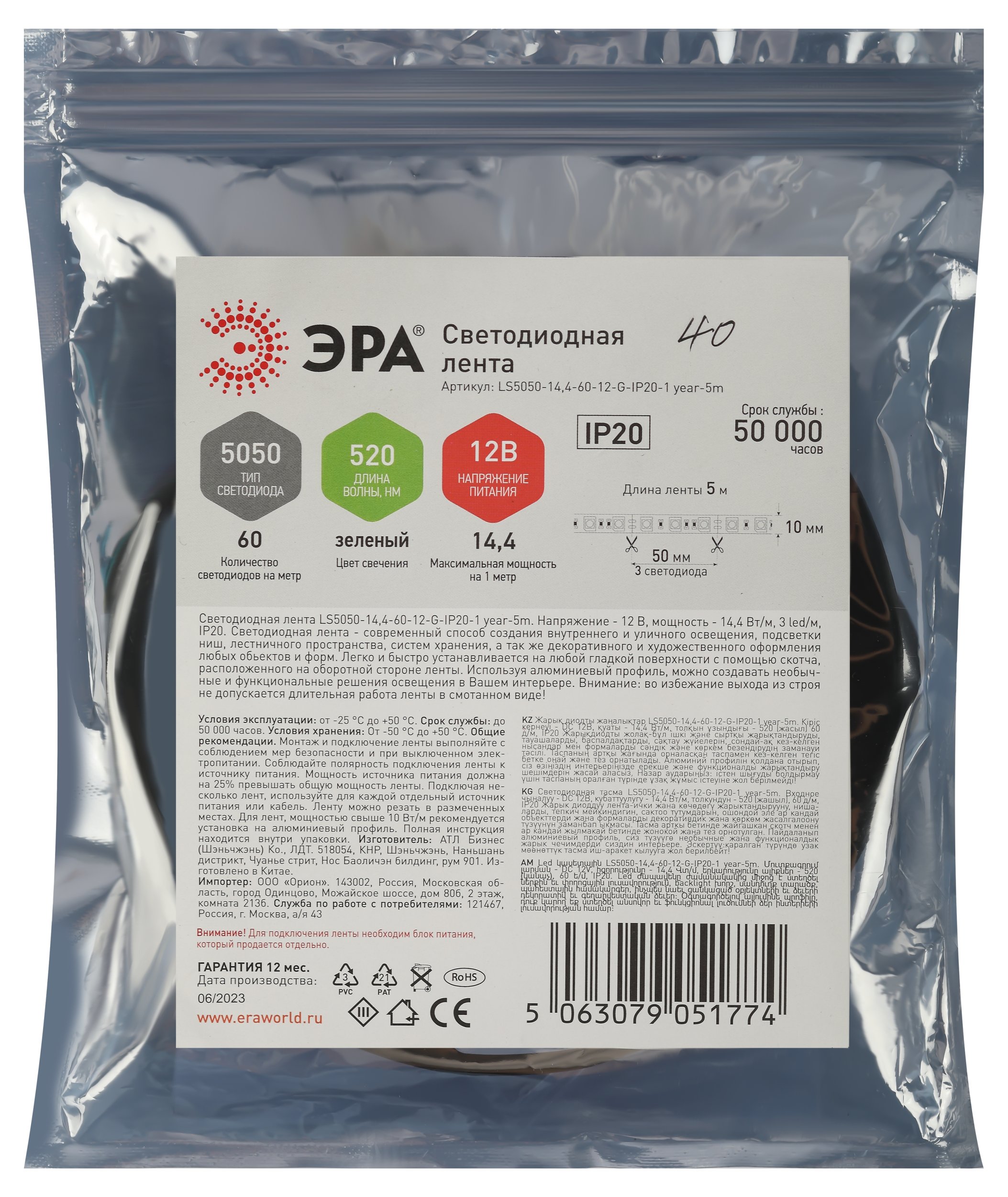 Артикул | LS5050-14,4-60-12-G-IP20-1 year-5m Б0059920