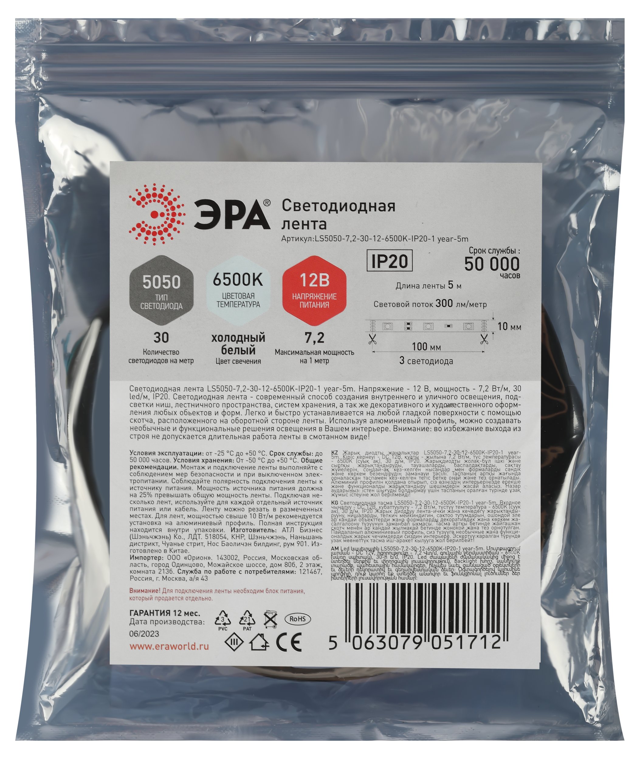 Артикул | LS5050-7,2-30-12-6500K-IP20-1 year-5m Б0059917