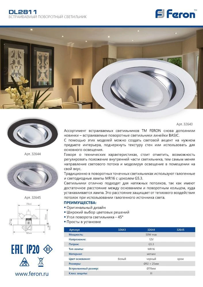 Точечный встраиваемый светильник Feron 32644