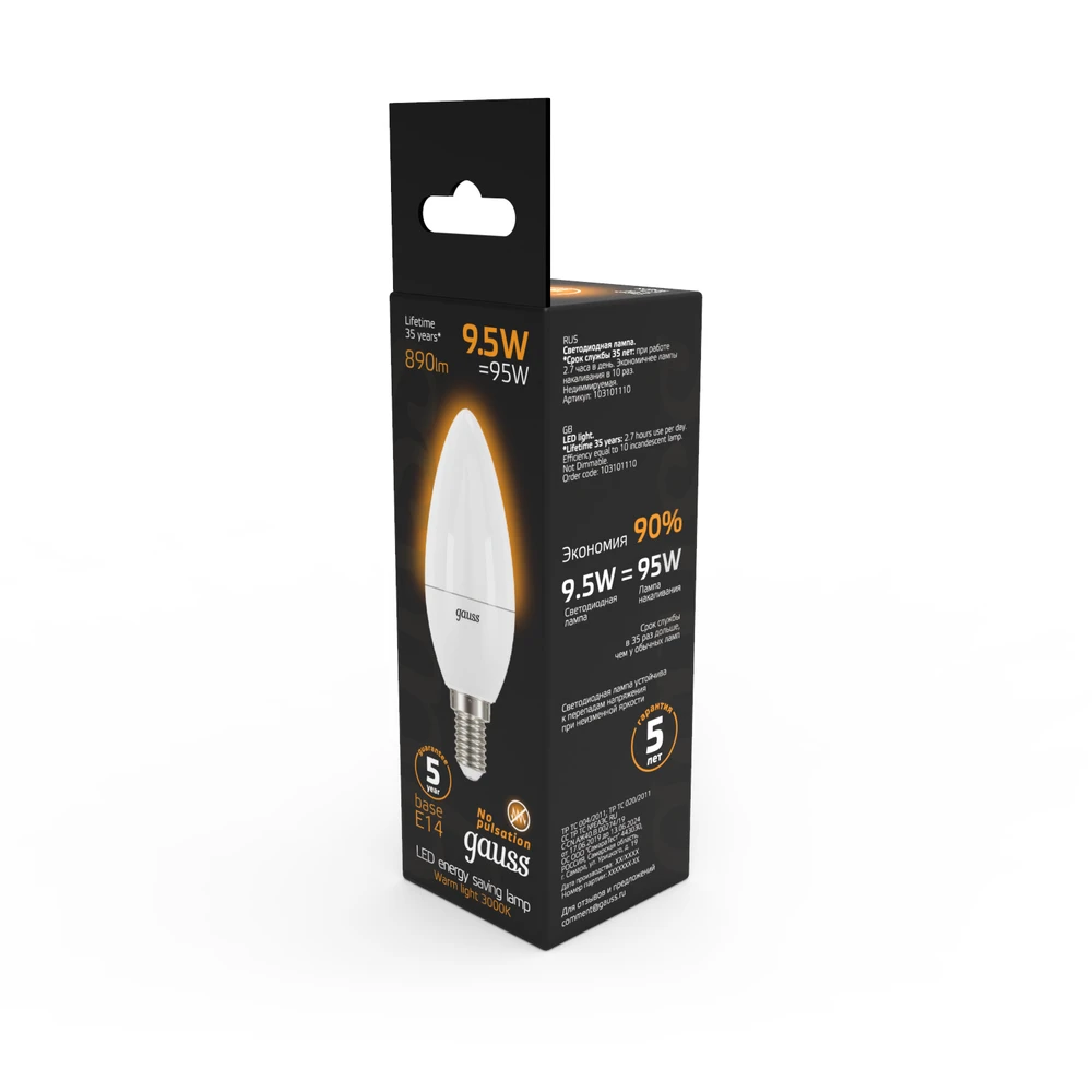Светодиодная лампа Gauss Свеча 9,5W 890Lm 3000K E14 103101110