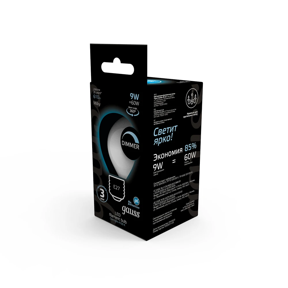 Светодиодная филаментная лампа Gauss Шар 9W 610Lm 4100K E27 105202209-D