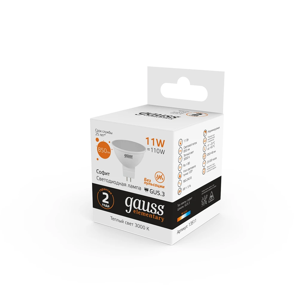 Светодиодная лампа Gauss Софит 11W 850Lm 3000K GU5.3 13511