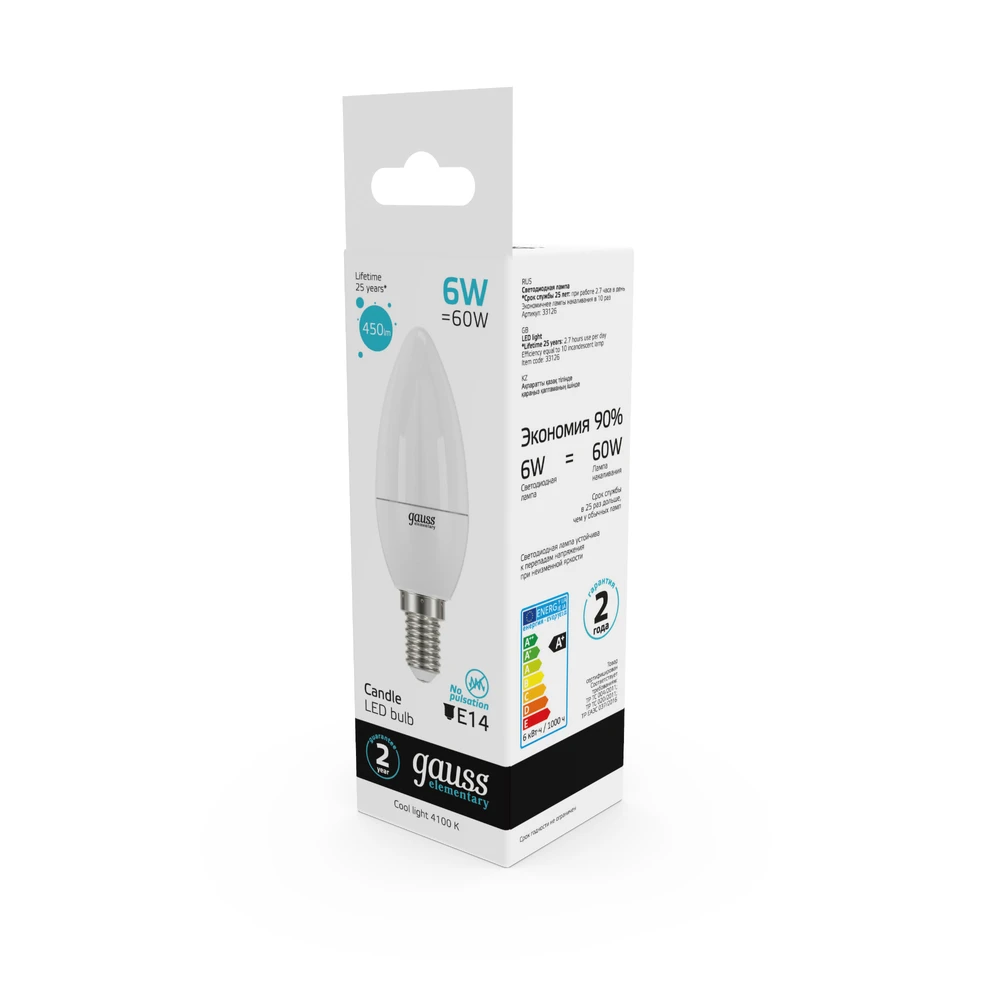 Светодиодная лампа Gauss Свеча 6W 450Lm 4100K E14 33126