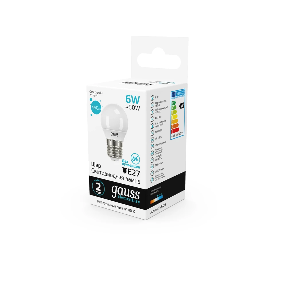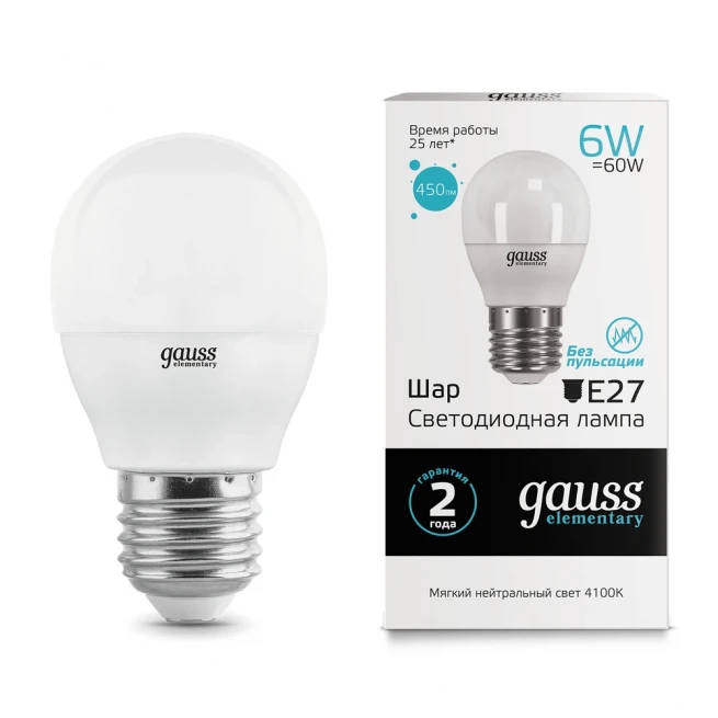 Светодиодная лампа Gauss Шар 6W 450Lm 4100K E27 53226